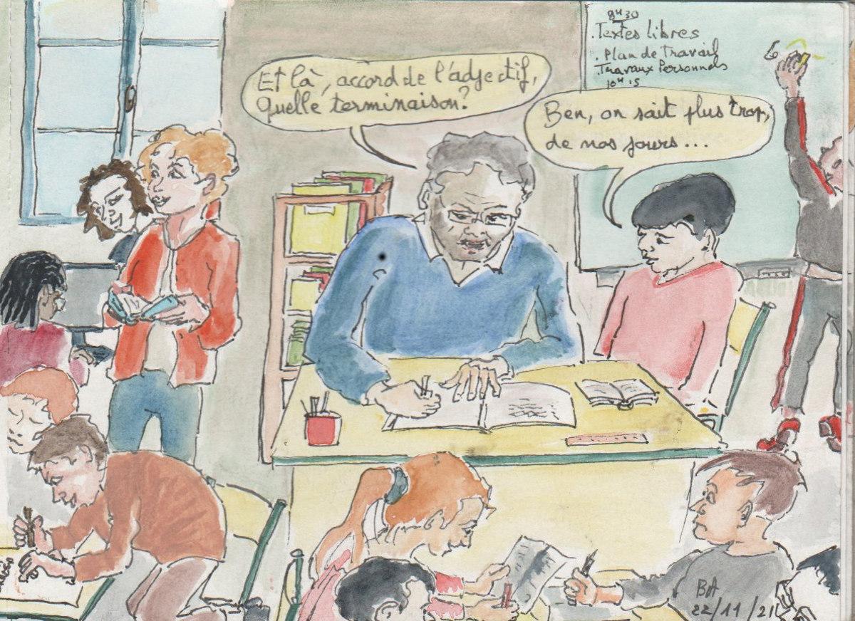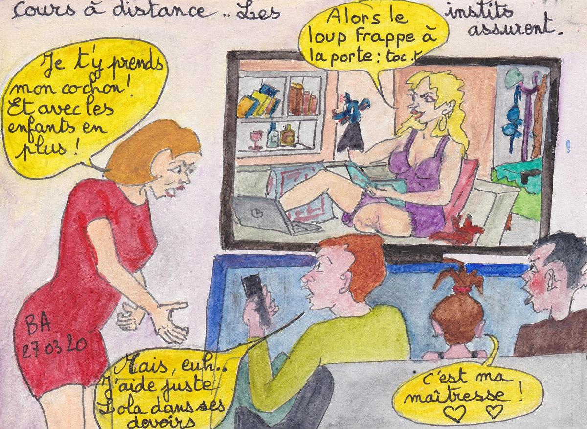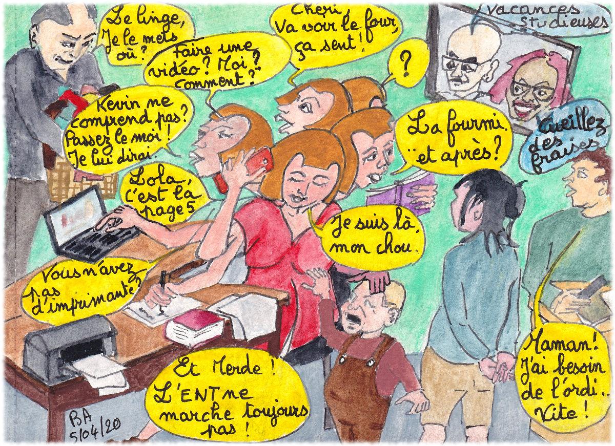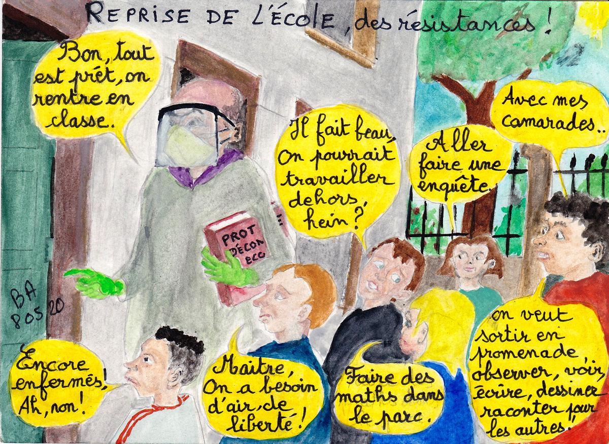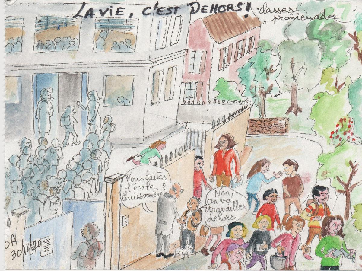 16 dessins faits confortablement à l'abri des murs de la maison envoyés en soutien aux collègues en première ligne devant leurs classes. 16 dessins sur l'école au milieu d'autres croquis sur notre petit monde confronté au virus et hésitant entre peur, colère, angoisse et inquiétude devant les effets d'un si petit organisme microscopique.